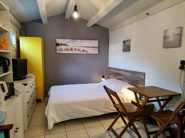 Elle est composée d’une pièce à vivre avec lit double (140x200), coin repas, TV, rangements, et d’une petite salle de douche avec WC.