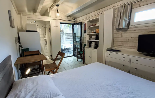 La cuisine extérieure couverte est équipée de plaques induction, d’un barbecue électrique, d’un évier et d’un espace repas qui vous permettra de manger dehors. Element rare pour un studio, vous pourrez vous détendre sur les transats dans un agréable espace extérieur - rénové en 2023.
