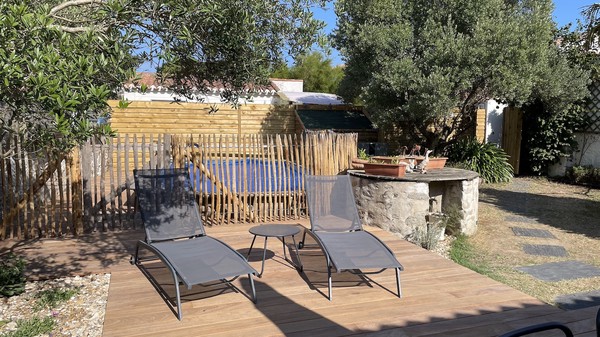 Dans la partie terrasse et jardin - rénovée en 2023 - une cuisine extérieure avec évier, barbecue et espace repas vous permettra de manger dehors, et vous pourrez vous détendre sur les transats au bord de la piscine chauffée et profiter de la douche extérieure.