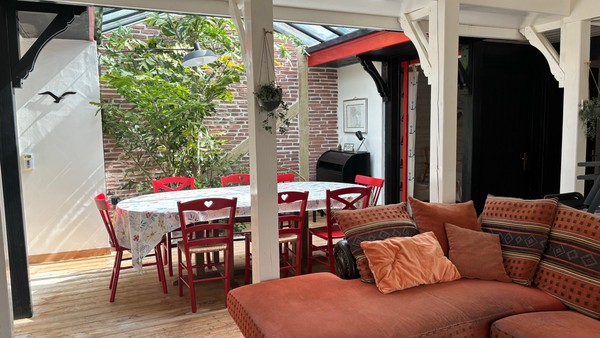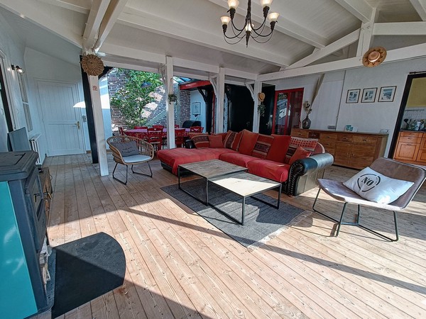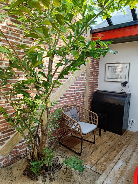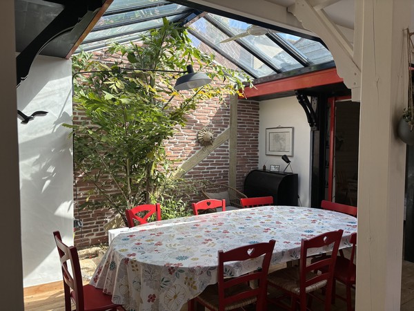 Elle s’organise autour d’une grande pièce à vivre, lumineuse et très agréable : salon avec charpente apparente et grandes baies vitrées donnant sur le jardin, salle à manger sous une verrière très lumineuse et agrémentée de palmier, coin bureau, TV, rangements.