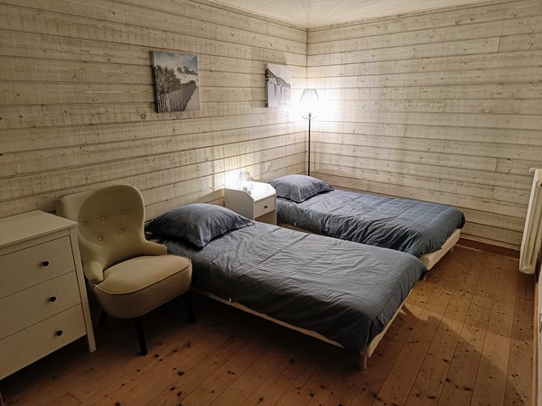 Quatre chambres sont réparties autour de la pièce principale, dont deux chambres avec lit double (l’une d’elles incluant une salle de douche et un WC) et deux chambres avec lits jumeaux ou superposés. Chacune dispose de rangements.