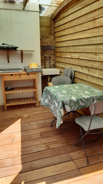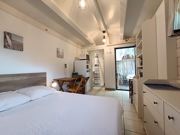 Petite maisonnette indépendante de 15 m2 pour 2 personnes, avec cuisine d’été sur une terrasse extérieure. Idéal pour une escapade en couple au bord de la mer.