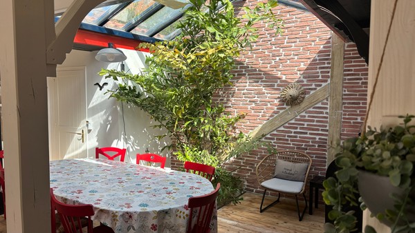 Elle s’organise autour d’une grande pièce à vivre, lumineuse et très agréable : salon avec charpente apparente et grandes baies vitrées donnant sur le jardin, salle à manger sous une verrière très lumineuse et agrémentée de palmier, coin bureau, TV, rangements.