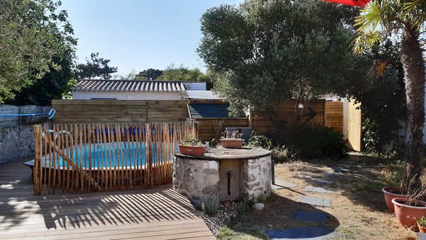 Dans la partie terrasse et jardin - rénovée en 2023 - une cuisine extérieure avec évier, barbecue et espace repas vous permettra de manger dehors, et vous pourrez vous détendre sur les transats au bord de la piscine chauffée et profiter de la douche extérieure.